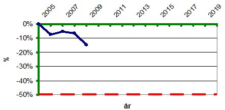 Mynd 3 Gongdin í útláti av vakstrarhúsgassi í sambandi við upphiting av sethúsum, handlum og stovnum árini 2005-2009, víst sum prosent í mun til útlátið í 2005. Reyða punkteraða linjan vísir málið, ið veðurlagspolitikkinum, sum er 50% undir útlátið í 2005
