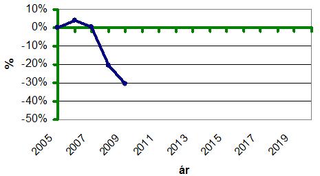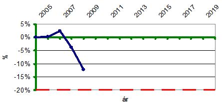 Mynd 1 Gongdin í samlaða útlátinum av vakstrarhúsgassi í Føroyum tíðarskeiðið 2005-2009, roknað sum munur í prosentum í mun til útlátið í 2005. Reyða punkteraða linjan vísir málið, sum er 20% undir útlátið í 2005.