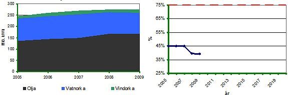 Mynd 4 (til vinstru) vísir elframleiðsluna (mió. kWh) árini 2005-2009 og hvussu stórur partur av framleiðsluni er grundaður á tær tríggjar orkukeldurnar. Mynd 4 (til høgru) vísir hvussu stórur prosentpartur av samlaðu elframleiðsluni stavar frá varandi orkukeldum. Í 2005-2007 var 45% av elframleiðsluni gjørdur við vatni og vindi. Í 2008 og 2009 fall hetta talið til 39%.