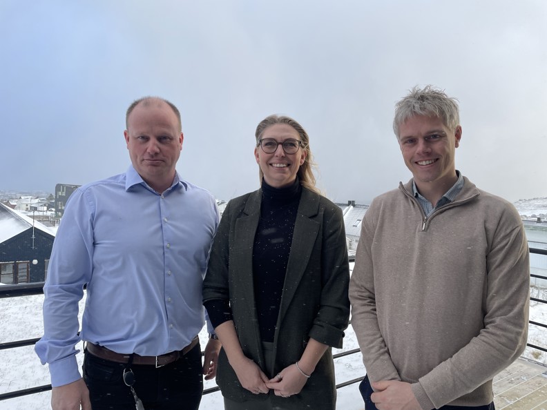 Eirik Hammer, verkætlanarleiðari hjá Sev, Roswitha van der Laan, leiðari hjá Schiphol, saman við Bjorn Postma, leiðara fyri háspenning hjá Schiphol